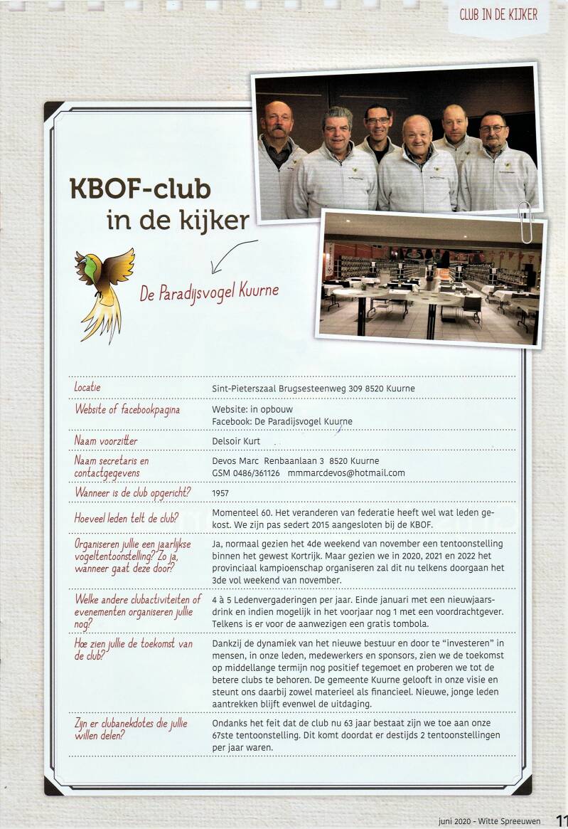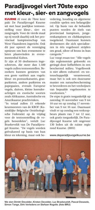 “Ook de volgende twee jaar zal het kampioenschap in de zaal Kubox plaatsvinden. Naast de keuring en tentoonstelling is ook de vogelverkoop op zondagmorgen een onderdeel die steeds op veel bezoek kan rekenen. Ook deze keer was dit niet anders. Om de exporuimte wat op te fleuren tijdens de tentoonstelling hadden de kinderen van internaat de Rijzende Ster uit Kuurne wat tekeningen van vogels ingekleurd op vraag van de Paradijsvogel Kuurne, die de organisatie van het provinciaal kampioenschap op zich nam.”