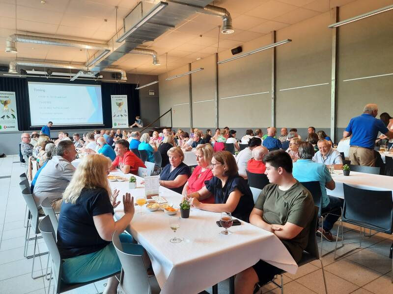 Het wordt een traditie dat onze ledenvergadering met bbq een succes is. Geen wonder gezien deze gratis is voor de leden. En hier maken we het verschil, veel verenigingen organiseren een bbq ten voordele van de club, De Paradijsvogel Kuurne daarentegen doet dit ten voordele van de leden. Dit dankzij de inbreng van trouwe sponsors. De Sint-Pieterszaal was net groot genoeg.
