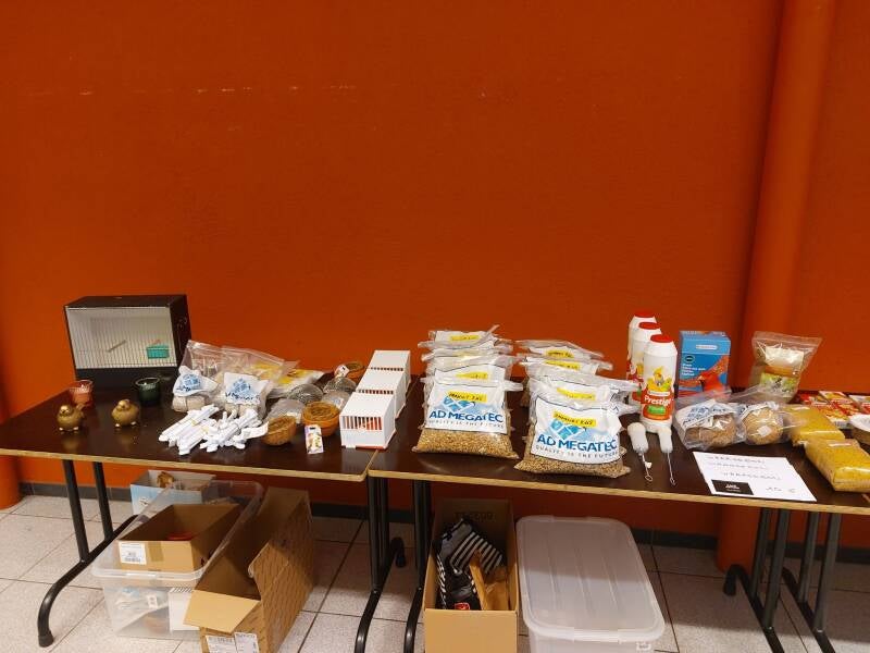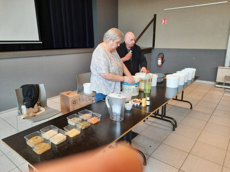 Wij konden het niet nalaten om nog eens Marnick Schacht en zijn echtgenote uit te nodigen om voor onze leden één en ander uit te leggen over hoe zij vogels kweken, verschillende soorten eivoer maken en het verstrekken aan hun vogels. En dat het aanschouwelijk is zie je op de foto. Na de voorstelling zijn de aanwezigen naar voor gekomen om alles nog eens van nabij te bekijken.